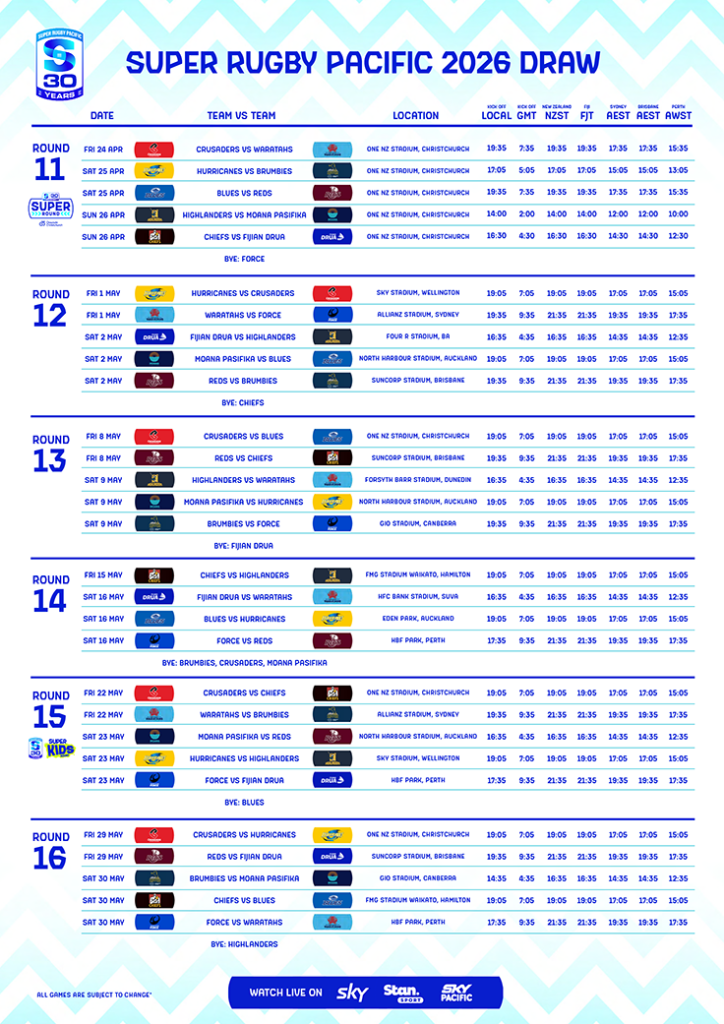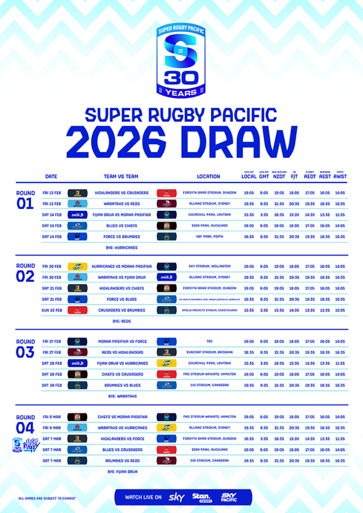 The following below is the Itinerary for Super Rugby Pacific 2026