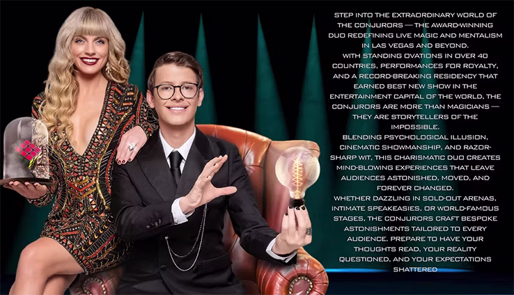 The Conjurors deliver unforgettable live performances that blend cutting-edge mind reading, theatrical storytelling, and jaw-dropping magic — all crafted for maximum impact on stage. With thousands of five-star reviews and sold-out shows in over 40 countries, their act has captivated audiences from Las Vegas to London, and everywhere in between.